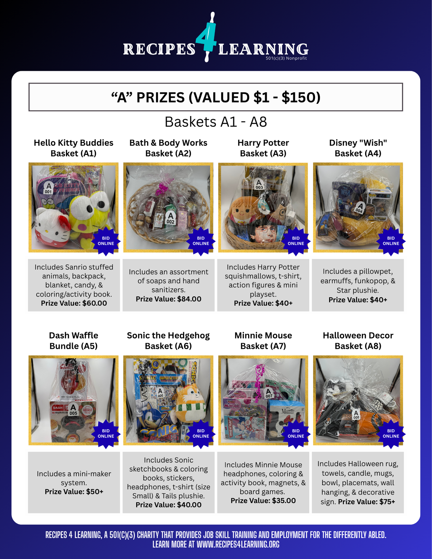Tickets of all types will be available for purchase at the venue, but tickets for the first 25 "A Prize" baskets can be purchased here at recipes4learning.org!
