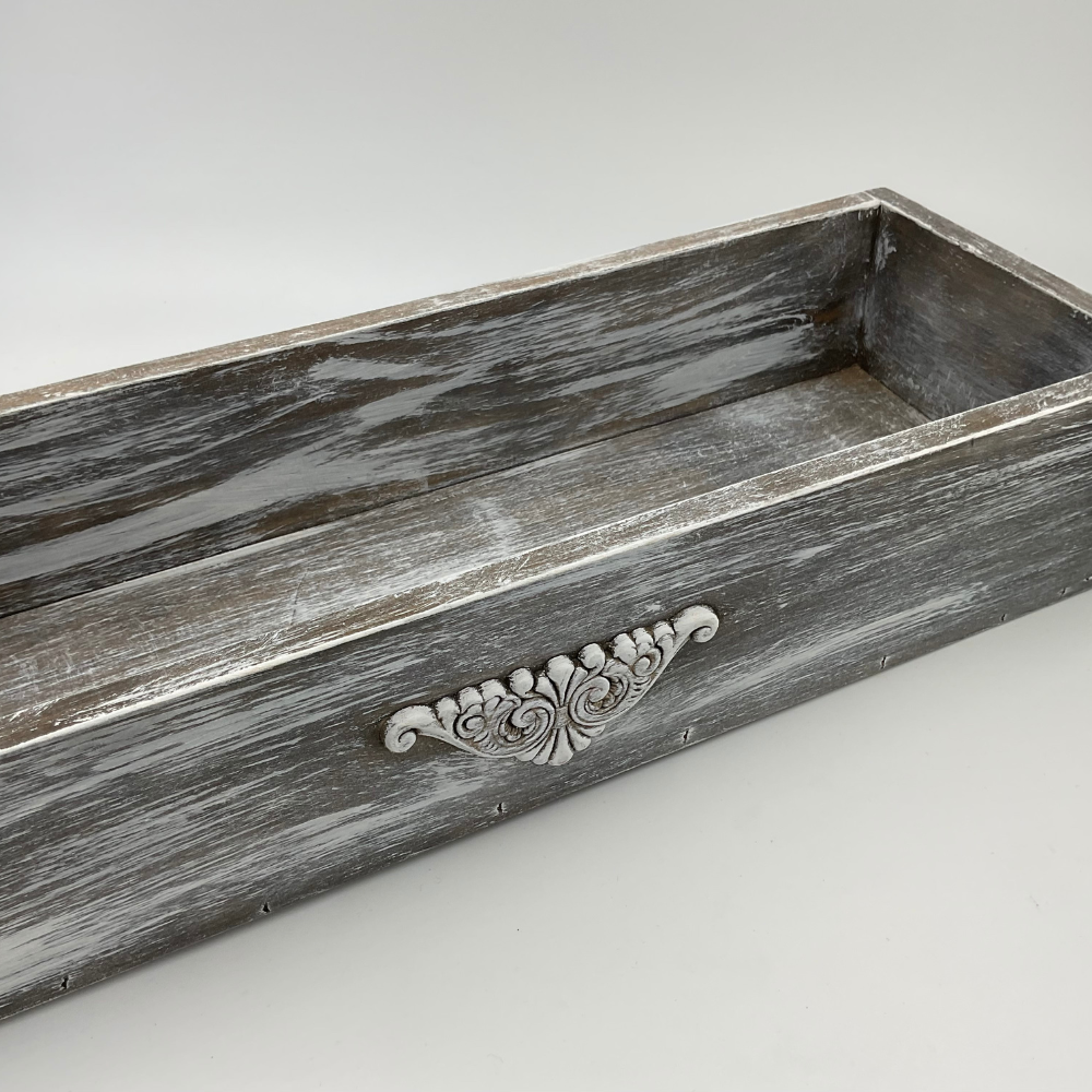 Wooden box for displaying things like candles in, with filigree design on the side.