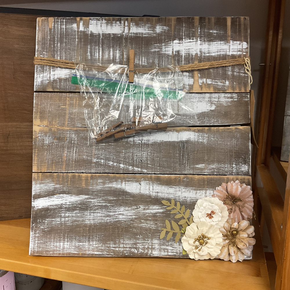 Rustic wooden display board with string and clothespins, for mounting pictures. Free-standing.