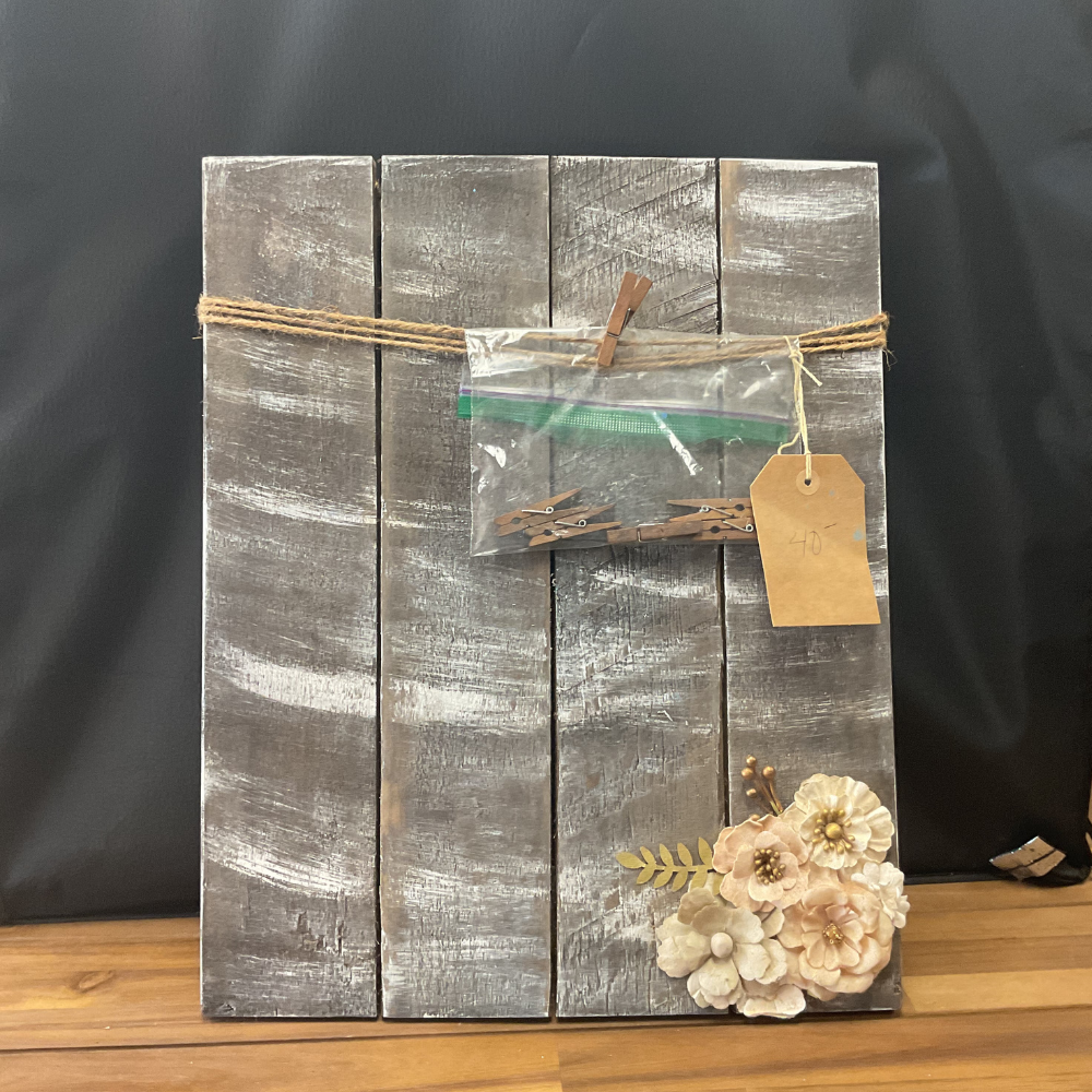 Rustic wooden display board with string and clothespins, for mounting pictures. To be hung on a wall.