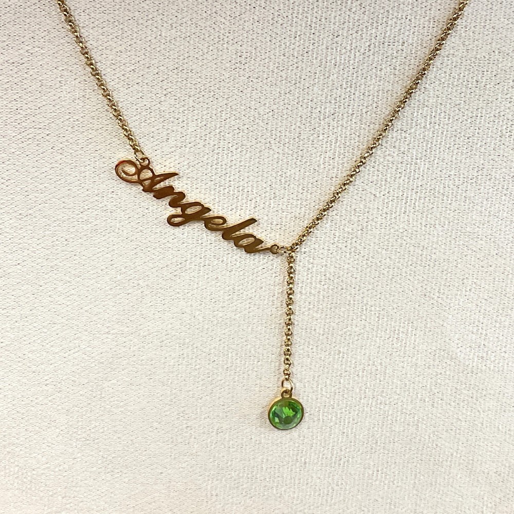 Get your name (up to 10 characters) in gold-plated stainless steel on a chain, with a dangling birthstone pendant.