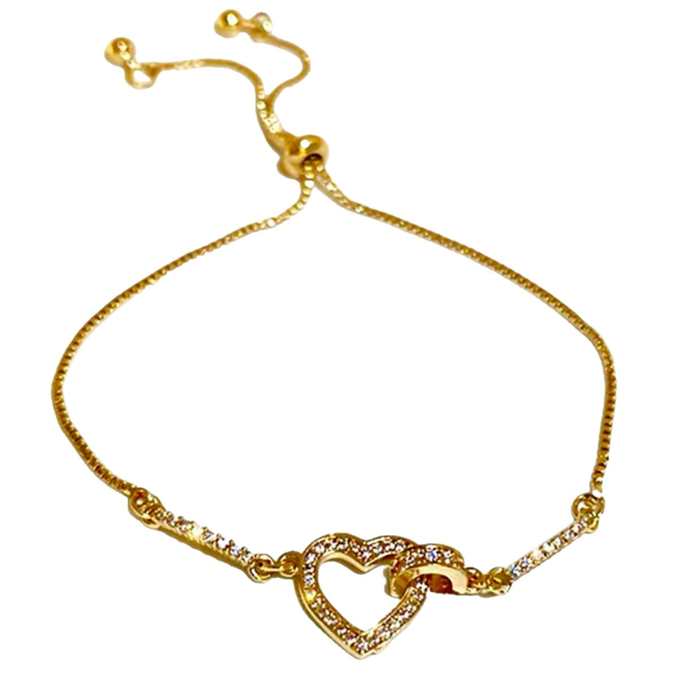 Bracelet with a crystal-studded heart charm on a gold chain.