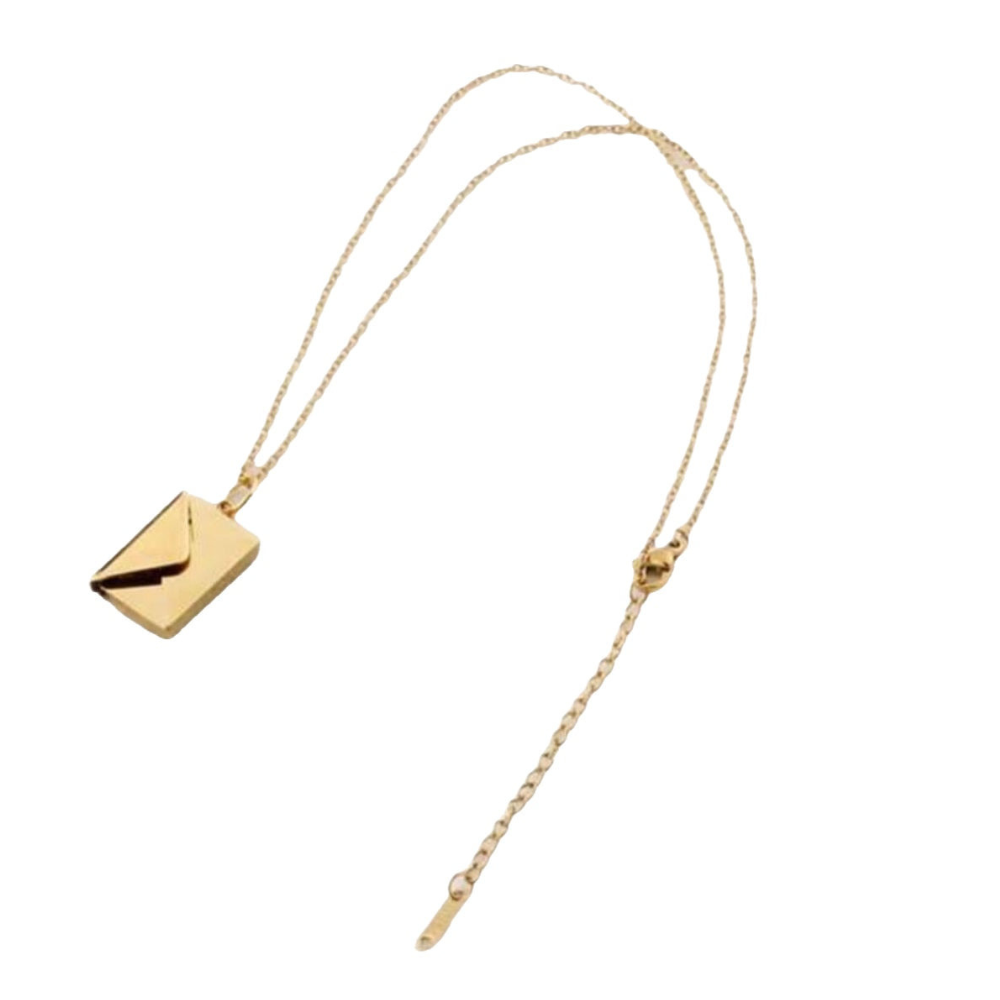 A gold necklace with an envelope-shaped pendant containing a tiny love message.