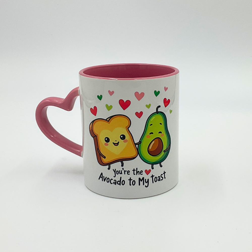 A mug bearing the phrase "You're the avocado to my toast", with cartoon images of an avocado and a piece of toast.