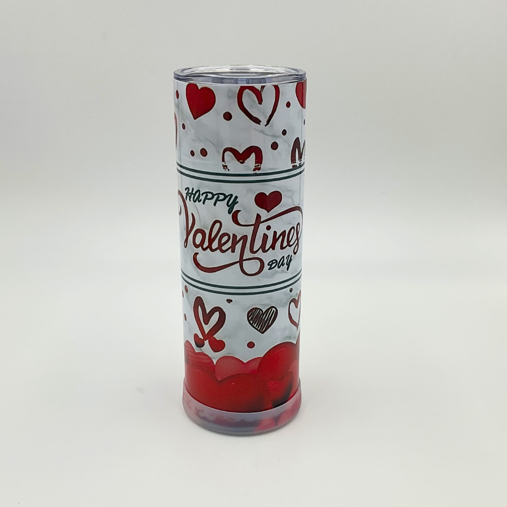 A white tumbler with red hearts and the words "Happy Valentines Day" in swirling script.