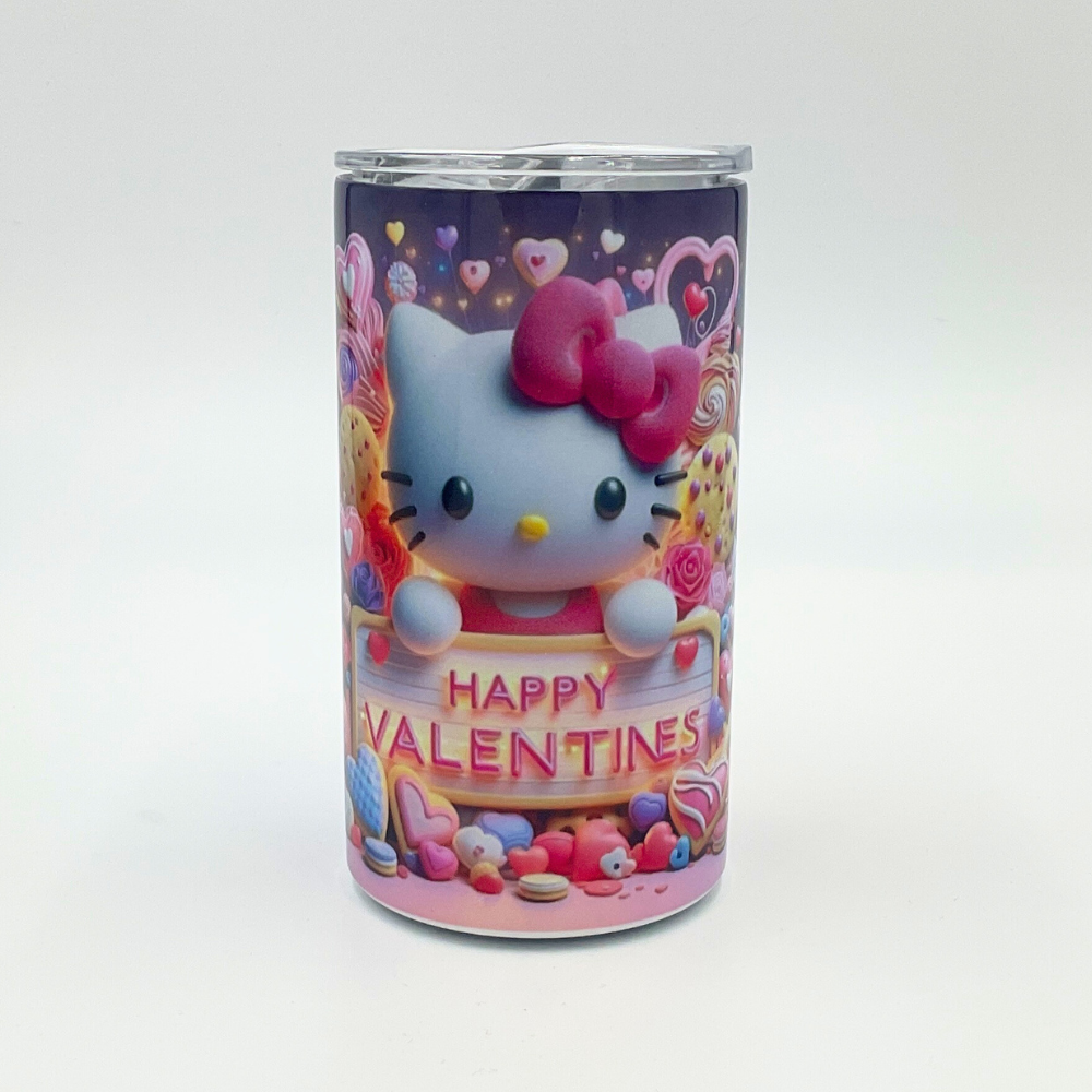 A small tumbler with Hello Kitty-themed art and the words "Happy Valentines".