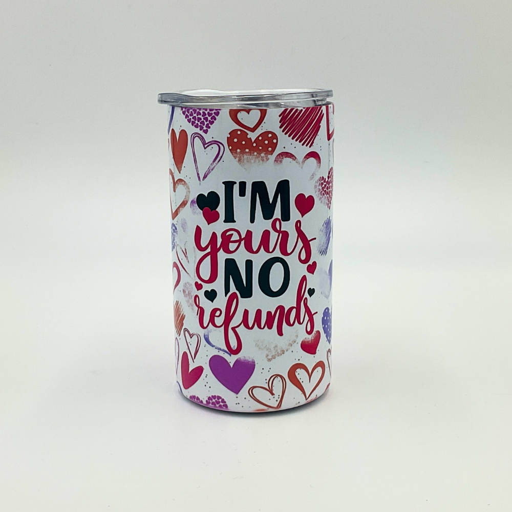 A small tumbler covered in Valentine hearts, bearing the words "I'm yours, no refunds."